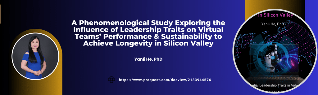To address this, Dr. Yanli He conducted a qualitative phenomenological study exploring how leadership traits influence virtual teams’ performance and sustainability, particularly in achieving longevity in Silicon Valley. From 2021 to 2023, she spent three years drafting her dissertation and interviewing 12 virtual team leaders and members in Silicon Valley. She then dedicated an additional year to refining her research in collaboration with the APA stylist team. On February 28, 2025, this transformative study was published on ProQuest. Link to this study