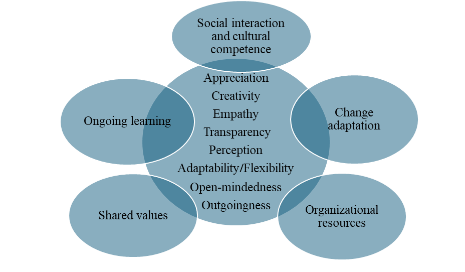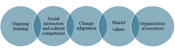 - Third, the findings revealed that leadership traits collectively enhance virtual teams’ sustainability in five themes: (a) ongoing learning, (b) social interaction and cultural competence, (c) change adaptation, (d) shared values, and (e) organizational resources (see Figure 7).